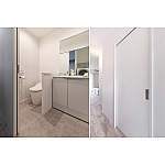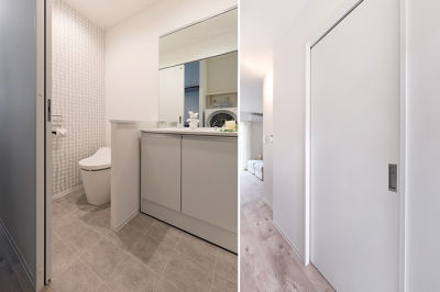 トイレと洗面がつながったサニタリースペースは、段差がなくバリアフリー。引き戸を閉めて隠すこともできます。