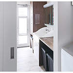 引き戸で仕切って独立できる洗面室。つくり付けの家具を再利用し、洗濯機の配置を変えて洗濯がラクになりました。