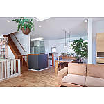 壁紙は白で統一し、すっきりとした雰囲気に。キッチンの腰壁には濃色のクロスを使用し、空間のアクセントになりました。