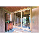玄関土間とホールの間に、透明アクリル入りの3枚連動引き戸を設置して寒さ対策に。閉めていても視覚的抜け感が生まれます。