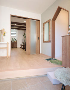 玄関ホールは御祖母様を介助しながら動けるよう広々と確保。玄関から洗面室への入り口は家の形にして空間のアクセントに。
