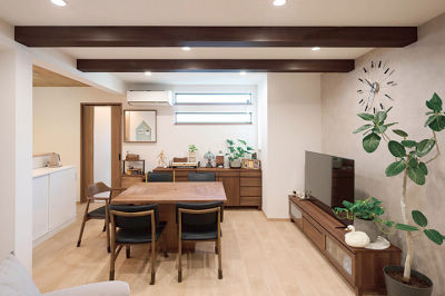 LDKは耐震補強で追加した梁に化粧を施し、デザイン性を高めました。3世代がお互いの気配を感じられる距離感で、安心して心地よく過ごせる住まいになりました。