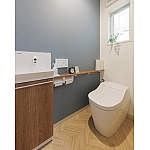 ホワイトのタンクレストイレと、くすみブルーのアクセントクロス。ほっと落ち着ける空間です。
