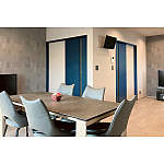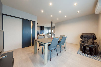 大人数が集まっても団らんが楽しめる広さのLDKに。ネイビーオーク柄の引き戸がアクセントになっています。
