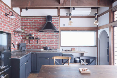キッチンの壁面にはモルタル造形でレンガをあしらいました。効果的に黒色を取り入れて空間を引き締めています。
