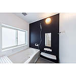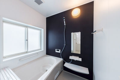 タイルの床だった浴室はユニットバスルームに。ダークブラウンのアクセント壁でシックに仕上げました。