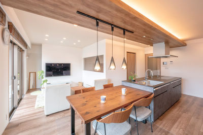 アイランドキッチンを主役にした開放的なLDK。木目柄でおしゃれな空間に仕上げました。