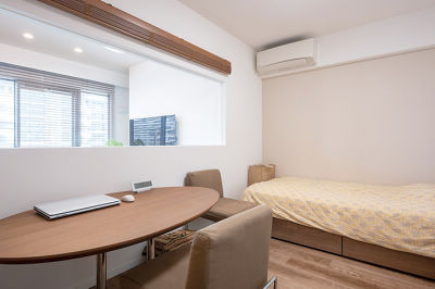 サービスルームには、リビングとのつながりをつくる大きな室内窓を造作。ひとりで集中したいときは、ブラインドを下ろして。