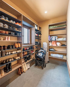 玄関横にあった部屋の一部を取り込んだ、明るく広いシューズクローク。ベビーカーやゴルフ用品まで、たっぷり入れられます。