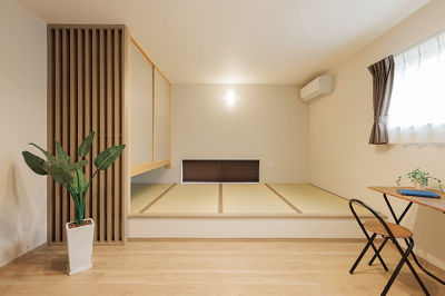 主寝室には、親子3人が並んで寝られる、畳スペースを設けました。スリット格子が和モダンな雰囲気を演出。