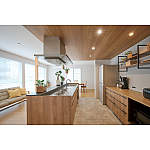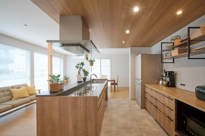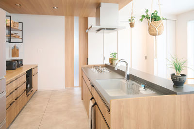キッチンは木目を活かしたコーディネイト。吊り戸棚をなくして圧迫感を解消。リビングの床もキッチンの色柄に合わせて統一感を出しました。