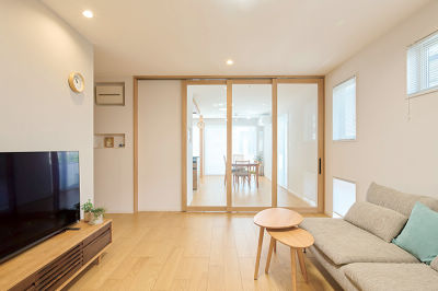 LDKに隣接するセカンドリビングは、奥様のリラックス空間。全面ガラスの3枚連動片引き戸で圧迫感なく過ごせます。