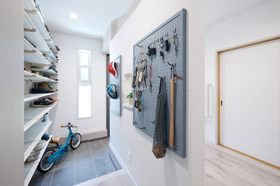 玄関ホールは家族用と来客用をゆるやかに仕切り、2WAYの動線を確保。シューズクロークを設置し、常に片付いた状態に。
