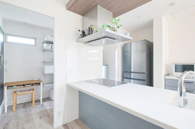 キッチン横にパントリーを配置。キッチンを中心に回遊でき、出し入れもスムーズ。デスクをおいて、マグネットボードを壁面に取り付けて便利に活用されています。
