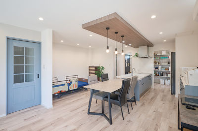 キッチン横にダイニングテーブルを設置して、配膳がスムーズに。ベッドにいるお母様とも会話ができる距離感で安心できます。