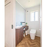 トイレは0.75坪を確保して、介護しやすく。壁の厚みを利用しトイレットペーパー収納用のニッチを新設。ヴィンテージ感漂う空間に仕上げました。