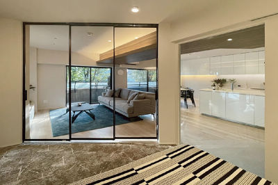 3LDKを2LDKに変更しお好みの使い勝手を創出し、明るく広がりのある空間に。間接照明を随所に取り入れて、モダンでラグジュアリーな住まいを実現しました。