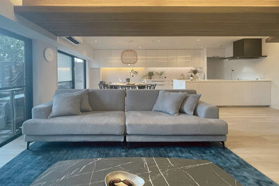 和室を取り込み、ひと続きの大きなLDKに。ホテルライクなデザインで、開放的な明るい空間になりました。