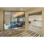 リビングと寝室の仕切りを、透明ガラスの引き戸にしたことで視界が広がり、ホテルのようなインテリアに。