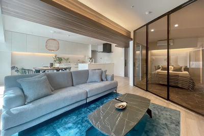 3LDKを2LDKに変更しお好みの使い勝手を創出し、明るく広がりのある空間に。間接照明を随所に取り入れて、モダンでラグジュアリーな住まいを実現しました。