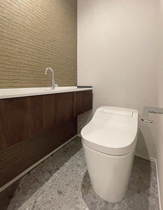 デザイン性の高い木目調のカウンターで収納量を確保しながら、シックで落ち着きのあるインテリアに。