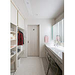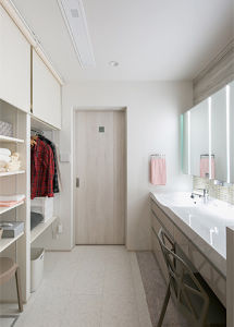 ランドリールームを兼ねた洗面脱衣室は収納も充実させました。「洗う・干す・仕舞う」を一ヵ所で完結できます。