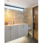 やわらかな間接照明が訪れる人をあたたかく迎える玄関。壁はタイル仕上げで高級感ある印象に。便利な手洗い場も設置しました。