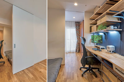 キッチンと洋室の間にあるサービスルームは、両側の引き戸を閉めれば在宅ワーク用の部屋に。インテリアカウンターを設置し収納も充実させています。