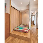 奥様の寝室として、小上がりのお部屋を新設。日中はカーテンを開け、隣接する部屋の一部としても使えるようになっています。