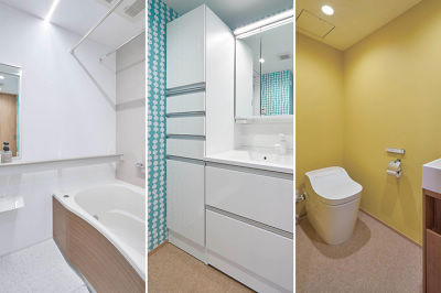 ライン照明が際立つ明るい浴室、ブルーのクロスが爽やかな洗面室、イエローの壁紙を使ったトイレなど、水廻りは色使いにもこだわりました。