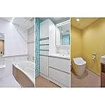 ライン照明が際立つ明るい浴室、ブルーのクロスが爽やかな洗面室、イエローの壁紙を使ったトイレなど、水廻りは色使いにもこだわりました。