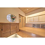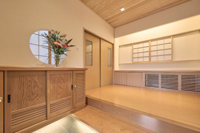 正面の飾り棚と丸窓障子が目を引く玄関。式台の下に間接照明を設置して足元を照らせる工夫を。下駄箱は既存のものを活用しました。