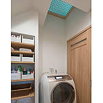 独立した脱衣室は天井に採光窓を設け、2階からの光が入る明るい空間に。着替えを置くのに便利な可動棚も。
