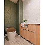上品な色合いの便ふたを採用。グリーンのアクセント壁、グレイッシュの床と調和して華やかで落ち着きを感じさせます。