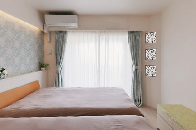 上品でやわらかな印象に仕上げた寝室。壁にはアイアンパネルのラグジュアリーな装飾がアクセントになっています。