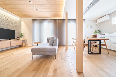 2階全体をLDKに。構造上、抜けない柱は化粧を施し、あえて目立たせ大空間のアクセントとして活用。2つの掃き出し窓からたっぷり光が入るリビング・ダイニングは、青空も眺められるようになりました。