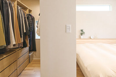 寝室のウォークインクローゼット。使う場所に適切な収納を設けることですっきり片付いた状態を維持。
