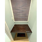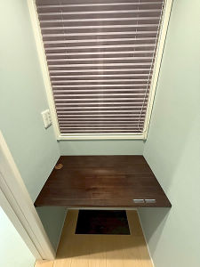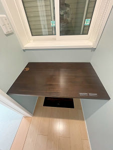 約1畳の書斎にある掘り炬燵をフラットな床に変更、スイッチプレートを移設、壁と一体になっているテーブルの高さを上げ心地よい書斎になりました。