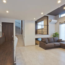 ご家族が増えて玄関やLDKも手狭になり、何かとお困りだったM様。そんなお悩みをすべて解決できるよう、1階は部屋数を変えずに、リビングの天井高を90センチ高くした「プチ吹き抜け」を採用。屋根や壁、基礎を外断熱にすることで小屋裏空間を減らし、その分、縦に広い伸びやかな家族の共用空間が生まれました。