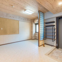 玄関から入って右側の部屋の壁を壊し、玄関から続く開放的な趣味室に変更。天井は無垢の杉材、壁はエコカラット、窓は内窓で調湿効果を考えました。