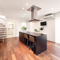 N様は夫婦ふたりが心地よく過ごせるようにと、アイランドキッチンのある住まいに全面リフォーム。ウッディで、モダンなスタイリッシュ空間に一新した広々LDKで、ご夫婦の会話も弾みます。施工店: 杜プラス 株式会社協和木材(旧:リファイン春日)