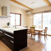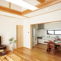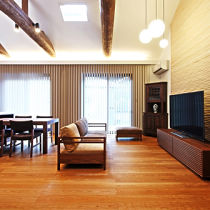 増築を重ねた住まいについて、「どうにかしなくては」と検討されていたK様。段差の多さも不満となり、建替を決断されました。当初は2階建てのプランもありましたが、広い敷地を活かした平屋建てに。建設中には息子さんの結婚、同居も決まり、新たな家で、新たな家族を迎えることになりました。コンセプトは「純和風」。「温かさがあふれてほしい」とのご希望から、ふんだんに自然素材が使われました。リビングは無垢の杉板を用い、壁はシラス材に。高い天井には丸太梁も見えます。「空気まで澄んでいるような気がするんです」と奥様。大きな窓からは日差しが降り注ぎ、いつも自然の温もりが感じられるリビングとなりました。施工店: リファインとよた南 中日住宅株式会社(旧:リファインとよた南)