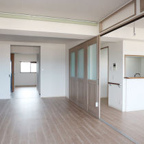 リビングと和室をひとつの洋室にして個室を充実させました。TPOに応じて空間を仕切れる開閉壁や通り抜けが可能なクローゼットを組み合わせ、光・風・互いの気配を感じられる安心の住まいになりました。施工店: リファイン草津 株式会社東和不動産