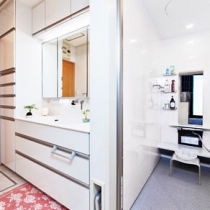 築20年が過ぎ、浴室、洗面所の設備機器が老朽化し、メンテナンスもできない状態。床、壁や天井のクロス、内装ドアの経年劣化も見られ、気になってきた。身の回りのものはできるだけ隠したいという要望。施工店: 株式会社木地由ナショナル建材社(旧:リファイン和歌山東)
