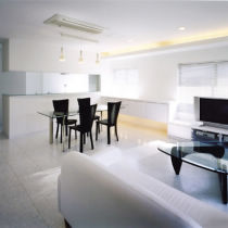 LDKは、モノトーンのインテリアに統一。壁面上部と造作家具の下部に設けた間接照明の