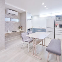 ご両親と二世帯同居をしているM様。生活リズムの違いを気にせず暮らせるよう、ガレージの一部をM様世帯用のダイニングキッチンにしました。扉柄や壁紙にこだわり、シンプルかつ高級感のある空間に。また、通りから視線が入らないよう高窓を採用。リフォームすることでM様もご両親もお互いに心地よい距離感で過ごせる住まいになりました。施工店: 松山建設株式会社(旧:リファイン勝山)