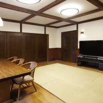 大正ロマンを感じさせる和モダンのリビングダイニングにこだわられたA様。天井の出っ張りをなくし、フラットにして梁を出すことで、「和」を演出しています。壁や天井の木部を濃い色に統一し、部屋全体の雰囲気をシックにまとめました。また、改装前に使用していた思い出の建具を腰板に再利用。少し赤みのある腰板は、部屋全体の色のバランスを整えてくれています。まるで老舗旅館のような部屋では、流れる時間もゆったり。A様と愛犬も気持ちよく寛げているようです。施工店: 株式会社しらかばハウジング(旧:リファインかりや)