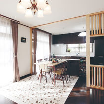 中古住宅を購入し、リフォームされたK様は「細かく部屋割りされた間取りを開放感のある空間に変えたい」とお考えでした。構造上、撤去できない壁には縦格子などのデザインを施してアクセントとして活用。ポイントとして一部の壁面を水墨画調にして、モダンな趣のリビングが完成です。和室とリビングは、格子の向こう側に広がる空間を互いに感じ合えることで、ひとつの空間としてつながりました。「壁があるからこそ生まれる空間があるのですね」とうれしい驚きを感じられているK様です。施工店: リファインとよた南 中日住宅株式会社(旧:リファインとよた南)