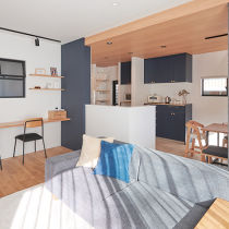 LDKと隣接する洋室をL字の大きな室内窓を設置してこもれる自宅オフィスに変身。落ち着いたウォールナットのオフィスで仕事もはかどります。透明ガラスの窓からは仕事中もリビングの家族の様子を感じられます。また、キッチン裏の柱を活用し、読書家の奥様の憧れ「飾れる本棚」を形に。ご夫婦が個々に有意義な時間を過ごせる場所をつくりました。