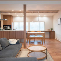 奥様のご両親のそばに住みたいとお考えだったS様。新築も検討されましたが、ご両親がほとんど使っておられない、広いご実家の2階をS様ご家族用にリフォームして同居されることに。2階からの眺望は抜群で、窓に自然の風景が広がり、夏には花火大会も鑑賞できます。その良さを生かし、開放的でおしゃれなLDKをとご希望になりました。そこで、壁を1つ取ってゆとりあるLDKを新設し、窓際に眺めが満喫できるカウンターを設置しました。天井も可能な限り高くしたうえで、一部を折り上げ天井風にしています。